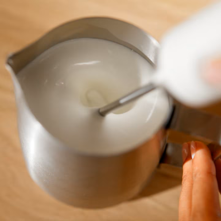 Mutite mleko najmanje 20 sekundi držeći NanoFoamer blago pod uglom. Počnite u sredini kako biste uneli malo vazduha, a zatim se polako pomerite ka ivici posude da biste dobili potpuno ujednačenu, glatku penu.